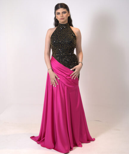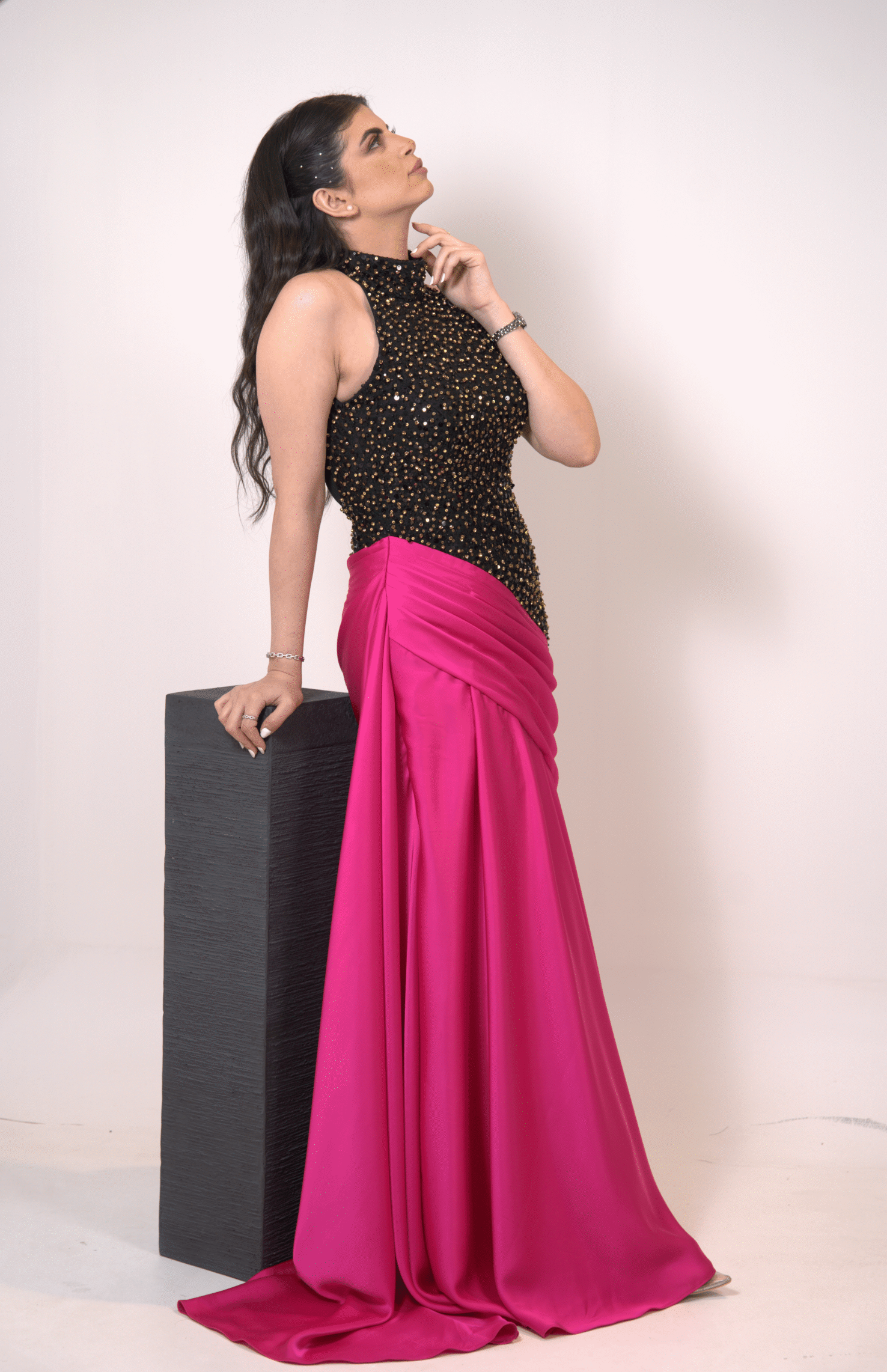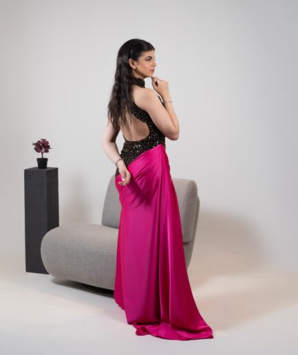From the side, the dress reveals its sculpted form and graceful fall. The craftsmanship in every seam and curve becomes beautifully visible, offering a glimpse into the designer’s intention.
