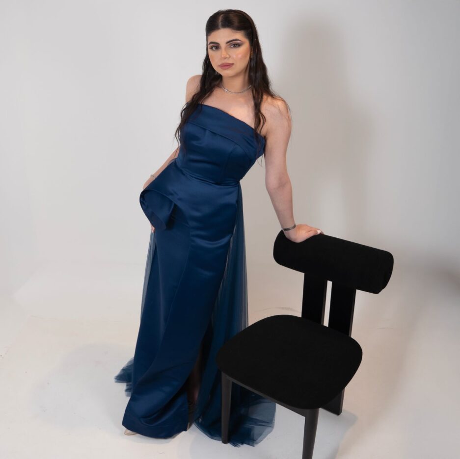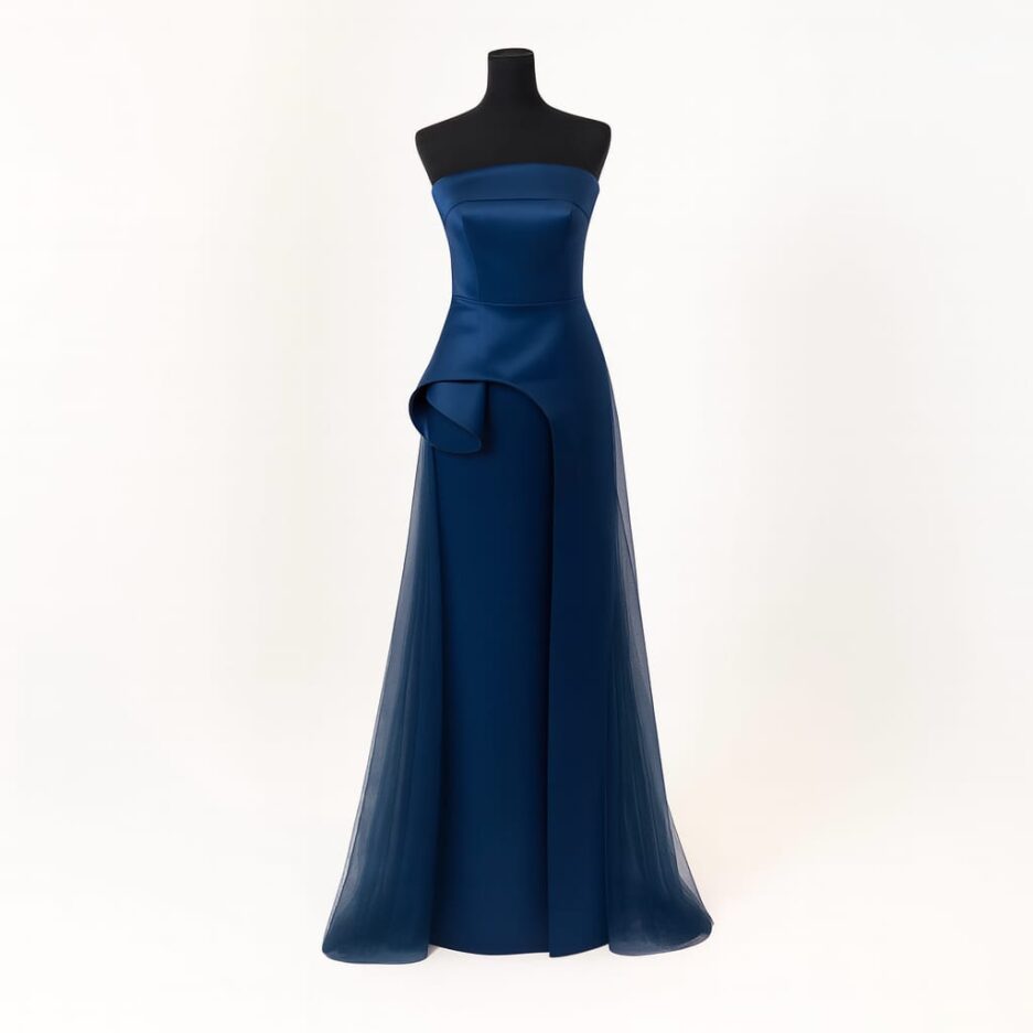 Command attention in this refined evening gown, where architectural design meets timeless grace. The strapless bodice is cut from lustrous midnight blue satin, sculpted to flatter the form while exuding minimalist sophistication.