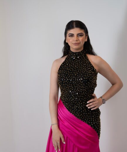 From the back, the gown reveals a daring open cut that contrasts beautifully with the structured front, adding sensuality and drama to the overall look. Designed for gala evenings, black-tie celebrations, and red-carpet moments, this piece balances bold embellishment with timeless elegance.