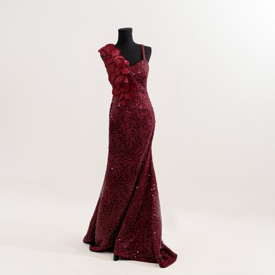 Turn heads in this striking evening gown, crafted in a deep wine red hue that exudes richness and sophistication. The fitted silhouette is adorned with shimmering sequins that catch the light from every angle, creating a glamorous, high-impact effect.